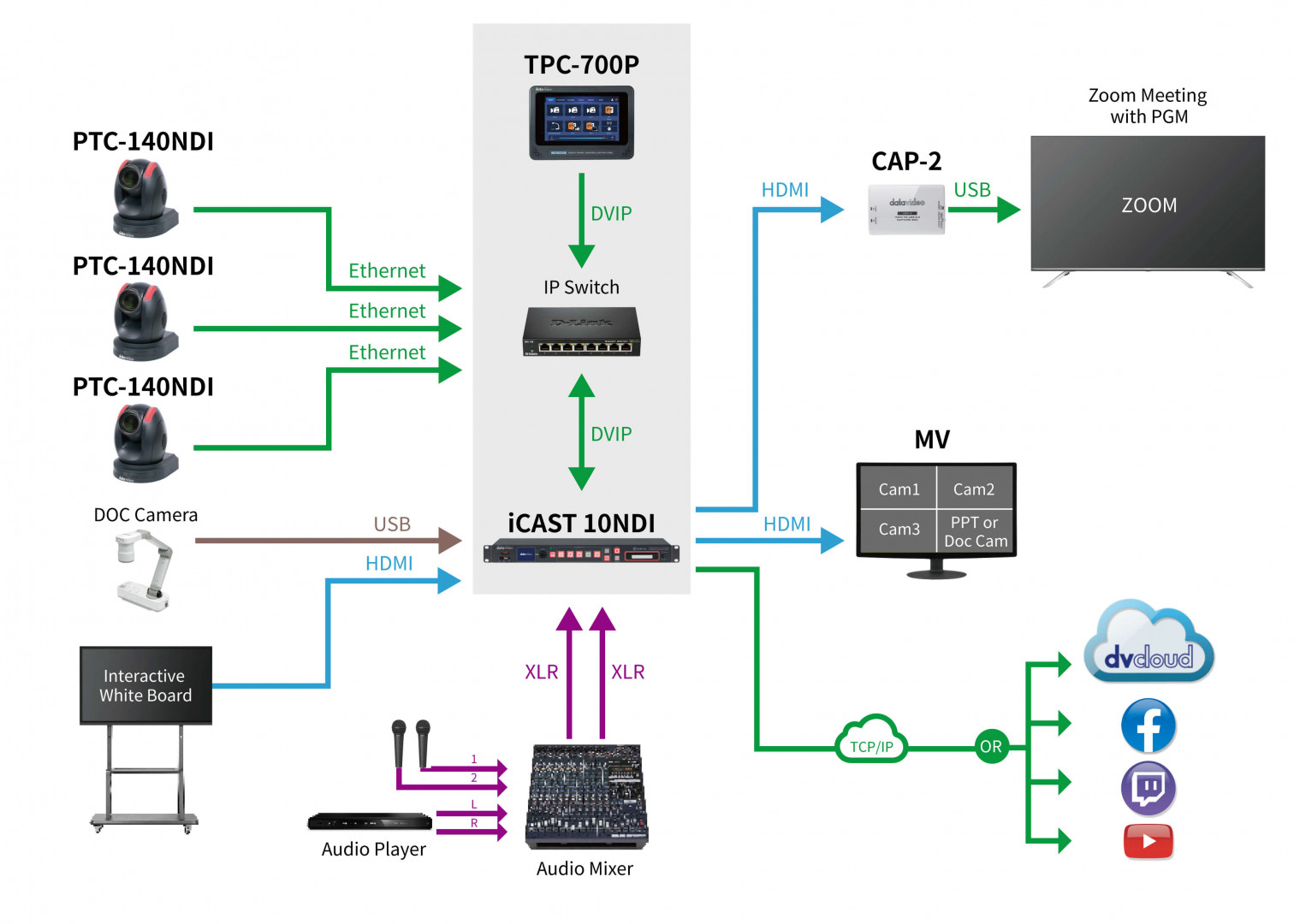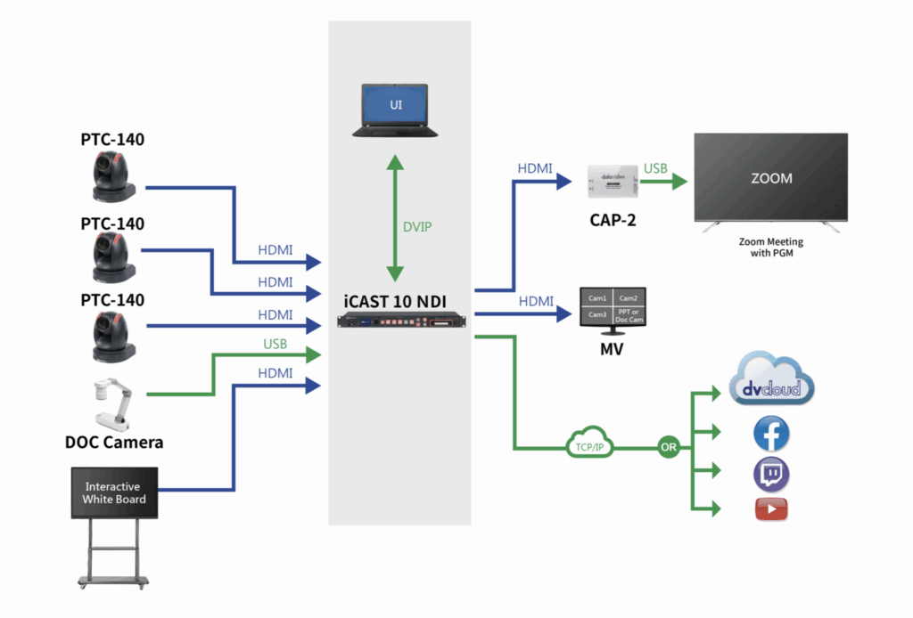 このストリーミングスイッチャーは、1つのSDI入力と4つのHDMI入力、およびドキュメントカメラ接続用のUSBポートを備えています。外部オーディオソースは、XLRバランスまたはRCAアンバランスオーディオポート経由で iCAST 10NDI に接続可能です。さらに、リモートロケーションからデバイスを操作できるビデオIPスイッチャーとしても使用可能です。