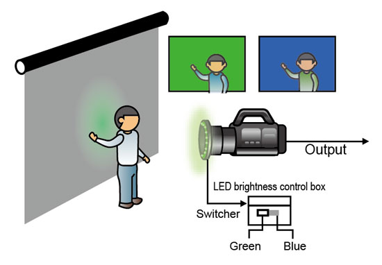 CKL-100は、LEDリングと再帰性反射スクリーンを使用し、簡単に完璧なバックグラウンド(青・緑)のクロマキー画像を撮影することができます。出演者の衣装や、撮影素材に合わせて、青または緑のLED(バックグラウンド)を選択できます。