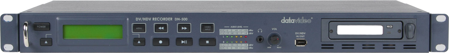 DN-500はリムーバブル・ハードディスクに映像を録画・再生できるHDV/DV入力に対応したレコーダーです。小型の1Uサイズなので、中継車システム・ロケーションシステム・イベント映像システムなどの録画再生機として使用することも可能です。